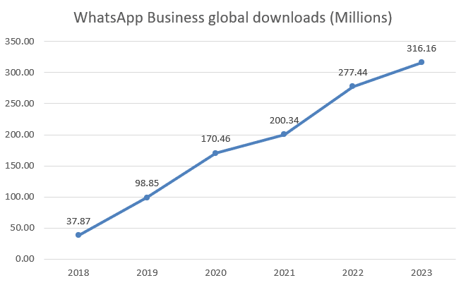 17. WhatsApp business downloads have increased in the past 6 years from 37.87 Million to 316.16 Million.