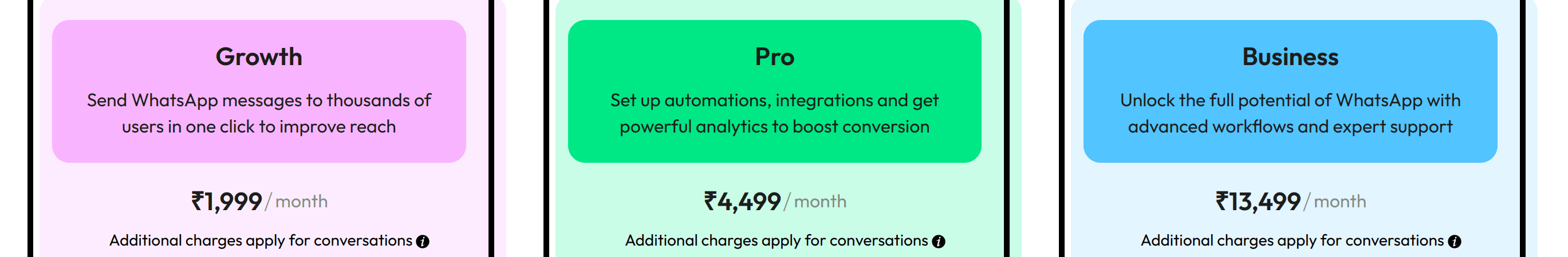 | Pricing: Fixed Cost - ₹10,788/Year Marketing - ₹0.88/Conversation | Pricing: Fixed Cost - ₹23,988/Year Marketing - ₹0.94152/Conversation |