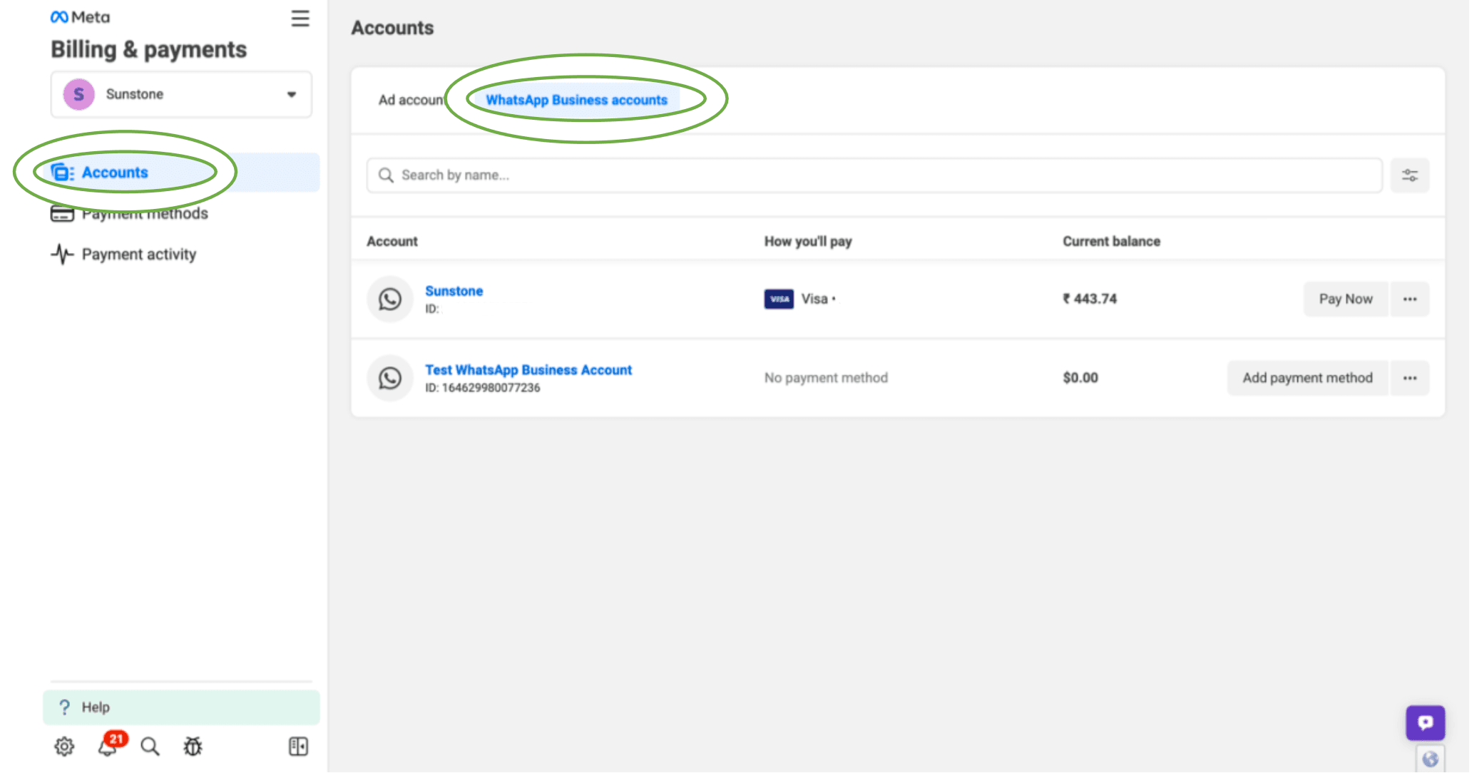 4. Now navigate to Accounts and choose WhatsApp Business Accounts.
