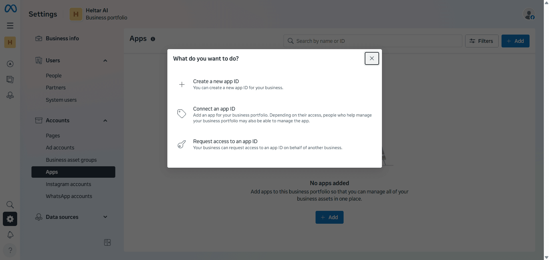 In the left sidebar, under Accounts, click Apps then Add and Create a new app.
