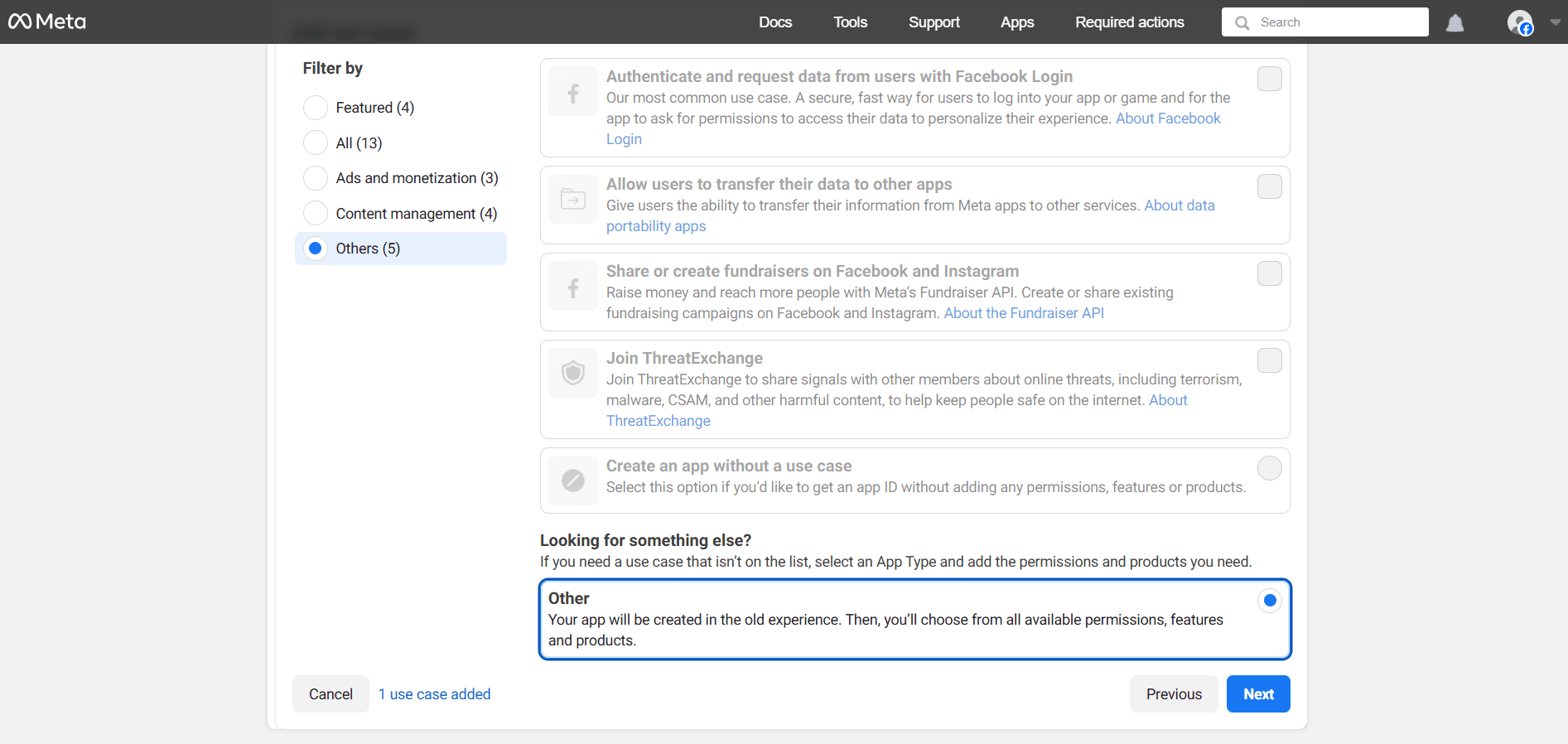 Fill in App Details and On Use Cases, choose Other, then Next.