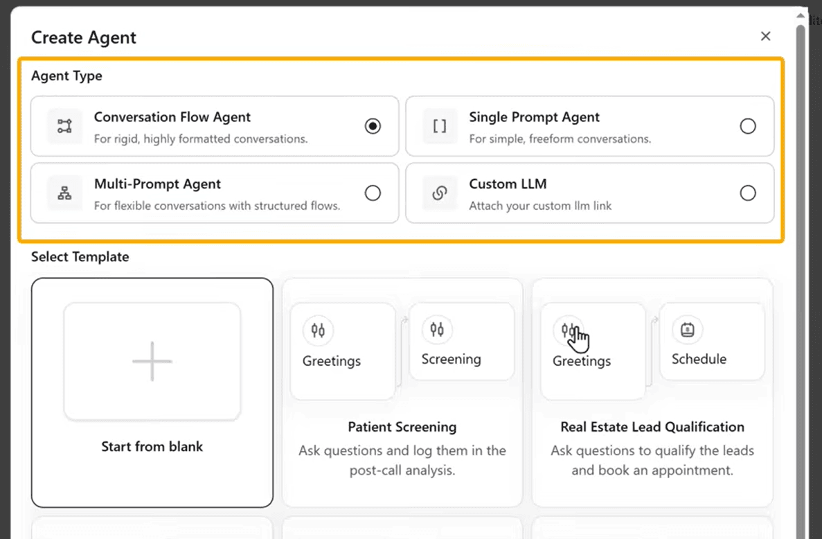For most use cases, select "Single Prompt Agent". This is perfect for lead qualification, customer support, and appointment setting.