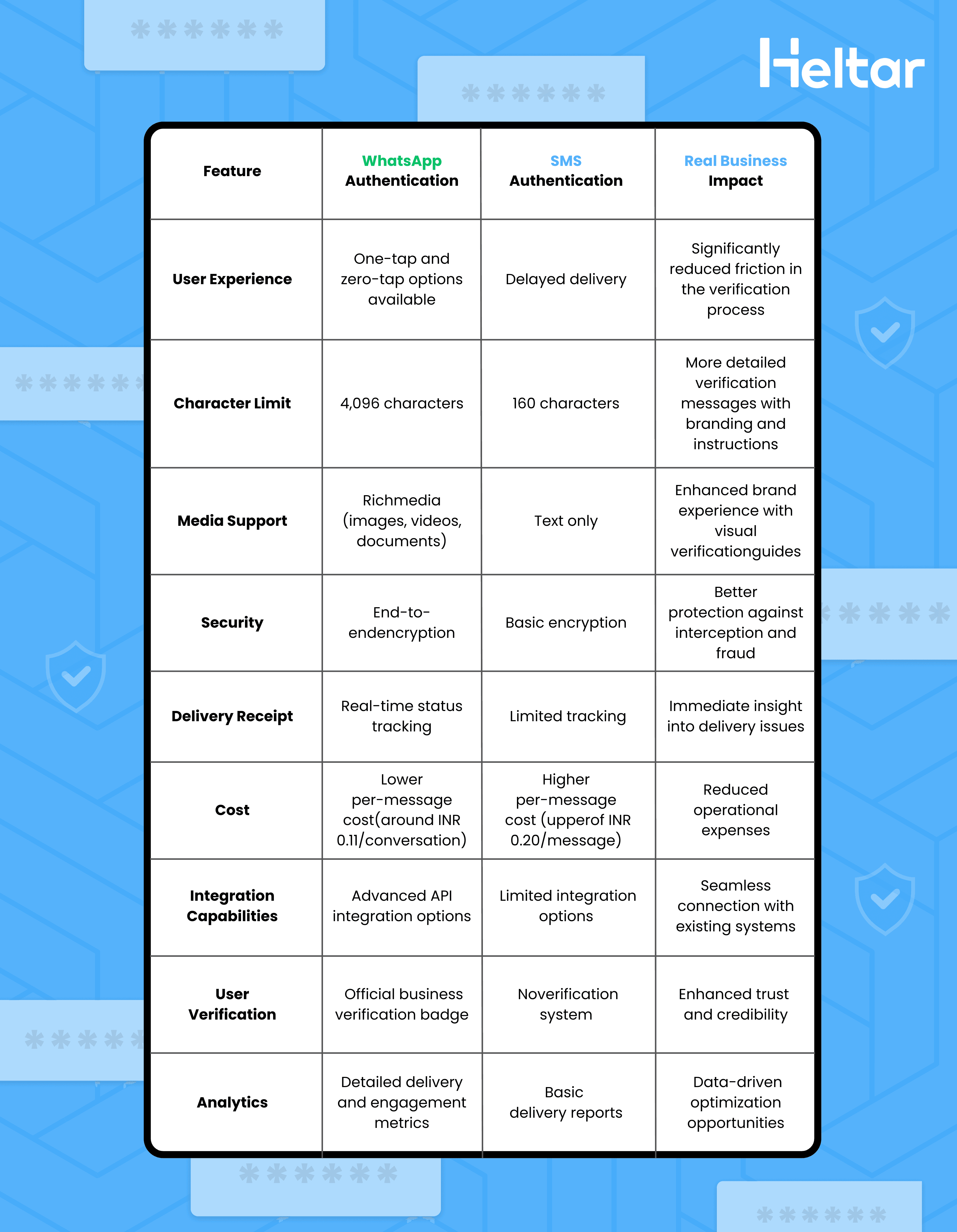 Let's break down the key differences that make WhatsApp authentication through Heltar a compelling choice: