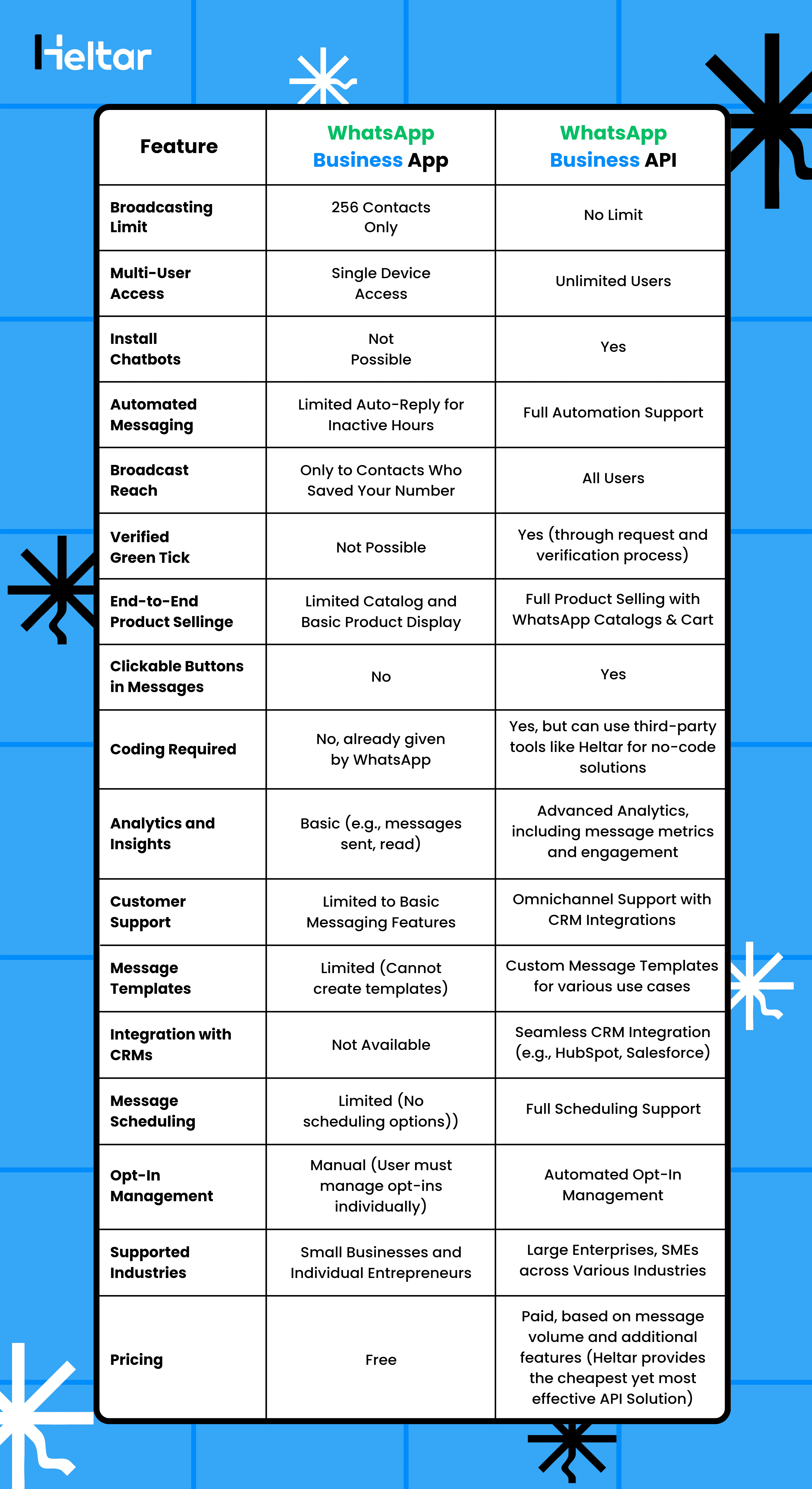 The API is not free, and businesses must use one of WhatsApp’s Business Solution Providers like Heltar to access it.