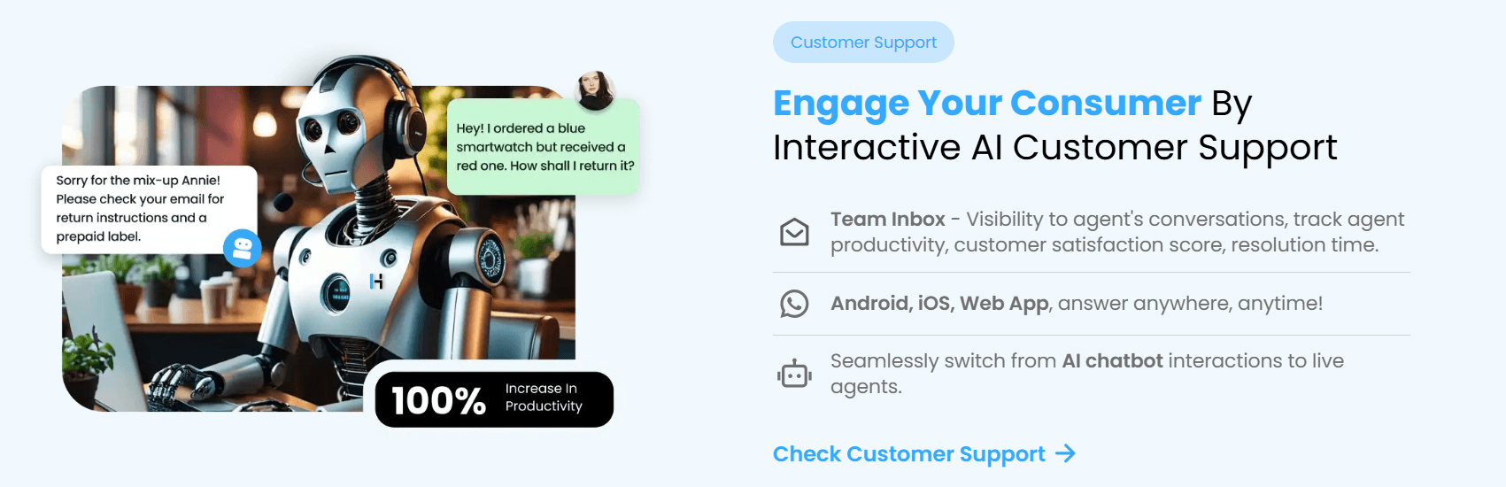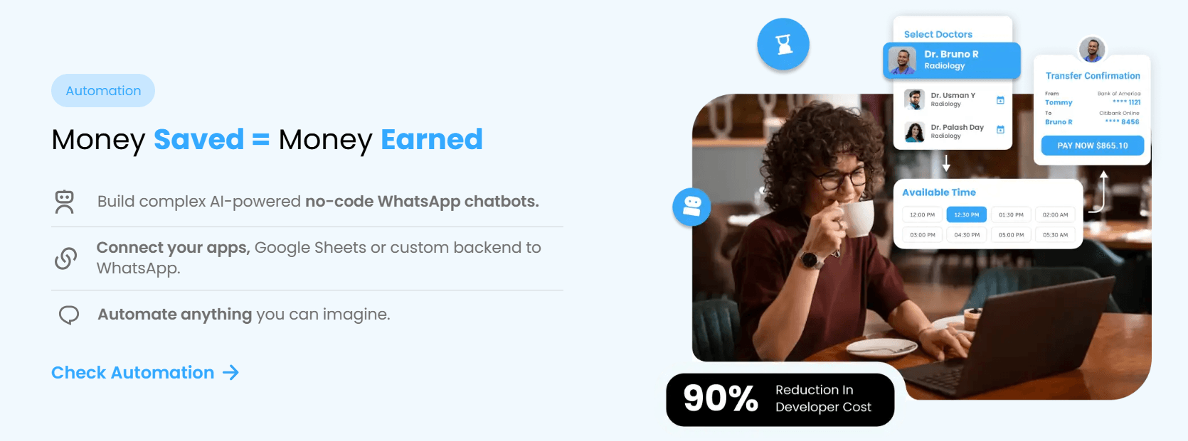 This tiered pricing ensures that as your business scales, your per-session costs fall dramatically. For better calculation of per message pricing, visit our pricing calculator.