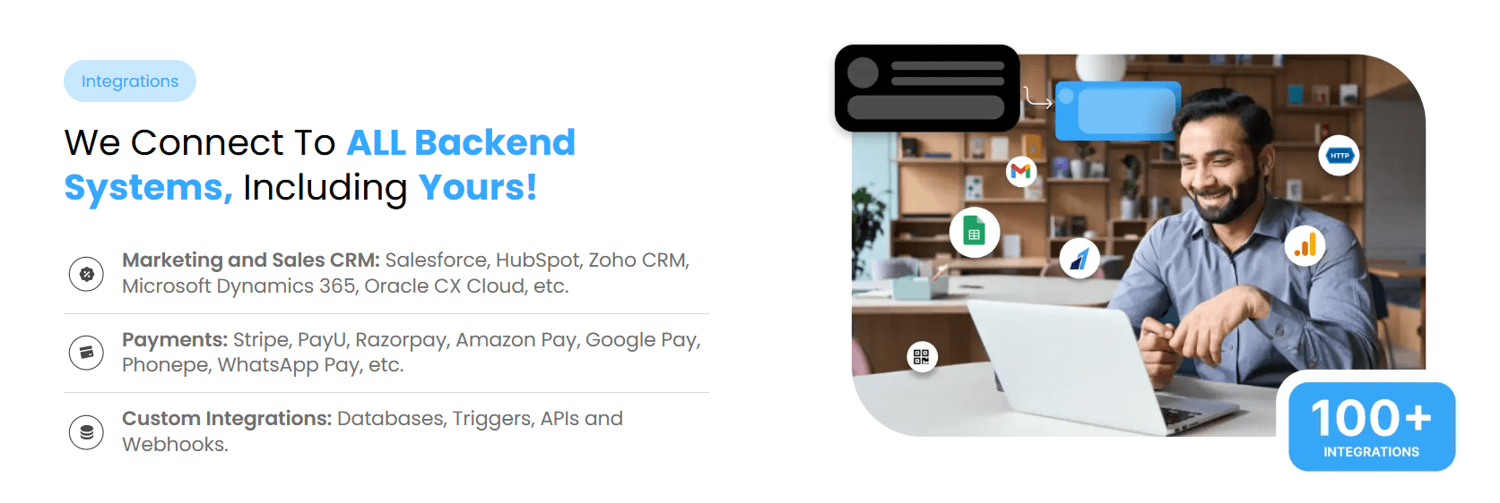 The API integrates with your backend systems or third-party apps (Shopify, HubSpot, Zoho, payment gateways, etc.), allowing seamless customer journeys inside WhatsApp.