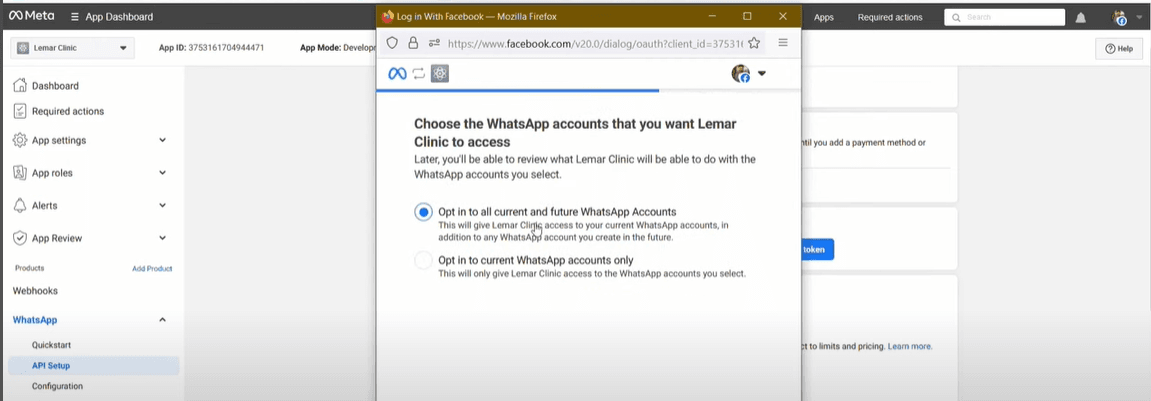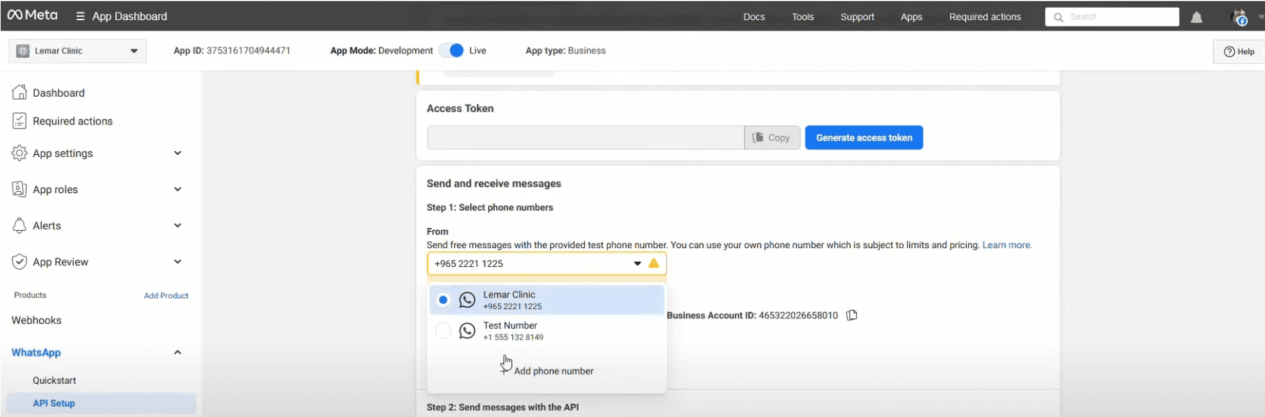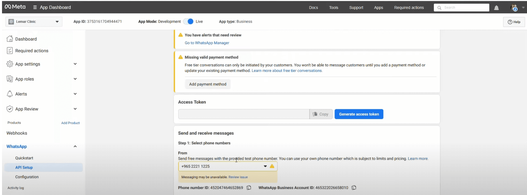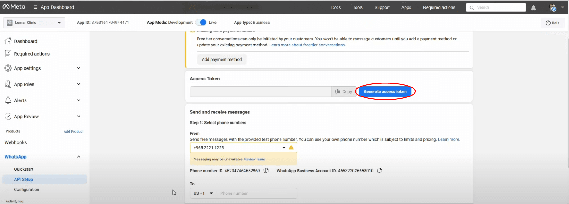 Once inside the phone number’s settings, click on "Generate Access Token." This refreshes the token used for authentication, resolving any expired or invalid token issues.